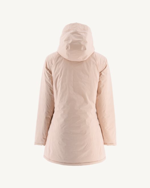 με το μεσαίου μήκους σακάκι με επένδυση Moscou, μπορείτε να αλλάξετε την εμφάνισή σας οποιαδήποτε στιγμή της ημέρας! αναστρέψιμο, αλλάζει από το ένα χρώμα στο άλλο σε μια στιγμή. εξαιρετικά ελαφρύ, έχει άνετο και κομψό ίσιο κόψιμο και γέμιση με πούπουλα. Το Moscou διαθέτει επίσης μια κουκούλα με επένδυση, δύο πλαϊνές τσέπες με φερμουάρ και μια μπροστινή τσέπη που κλείνει με Velcro.