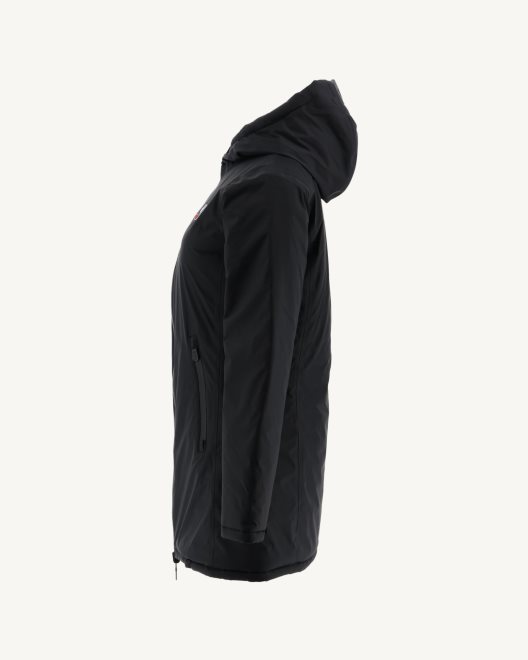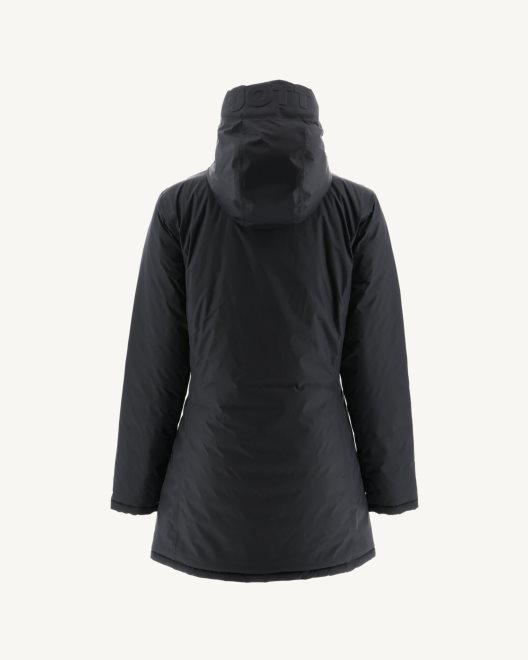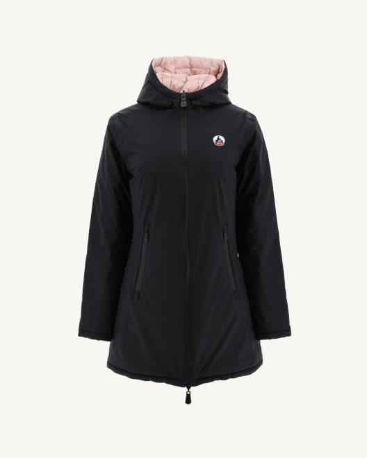 με το μεσαίου μήκους σακάκι με επένδυση Moscou, μπορείτε να αλλάξετε την εμφάνισή σας οποιαδήποτε στιγμή της ημέρας! αναστρέψιμο, αλλάζει από το ένα χρώμα στο άλλο σε μια στιγμή. εξαιρετικά ελαφρύ, έχει άνετο και κομψό ίσιο κόψιμο και γέμιση με πούπουλα. Το Moscou διαθέτει επίσης μια κουκούλα με επένδυση, δύο πλαϊνές τσέπες με φερμουάρ και μια μπροστινή τσέπη που κλείνει με Velcro.